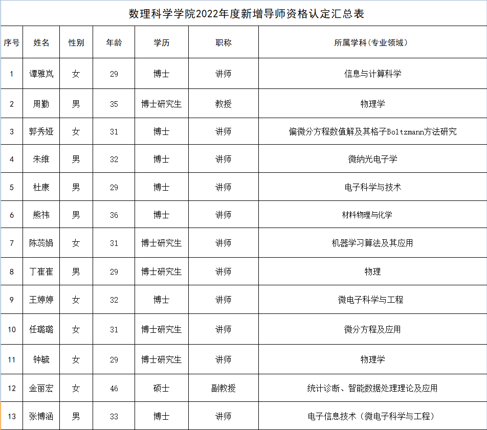 根据《十大体育网站硕士研究生导师管理及考核办法(暂行)》及《2022年度新增硕士研究生导团队格认定的审定办法》,现将公司2022年新增硕士研究生导师名单公示如下: