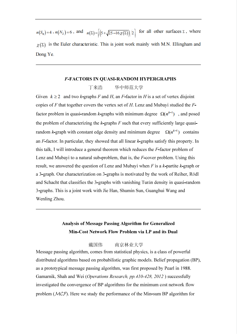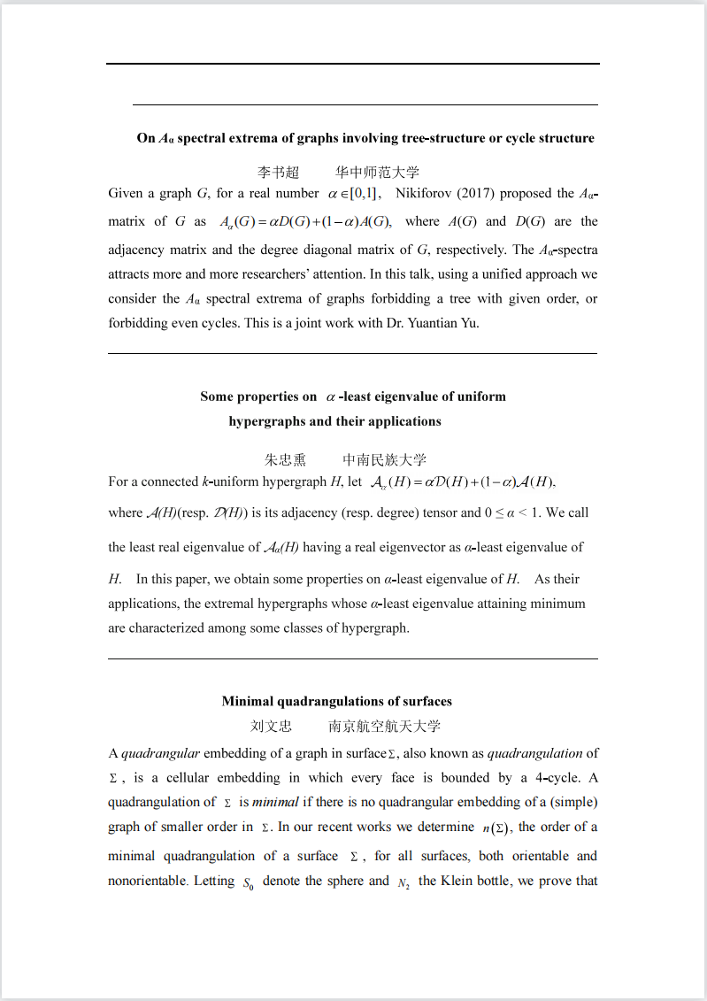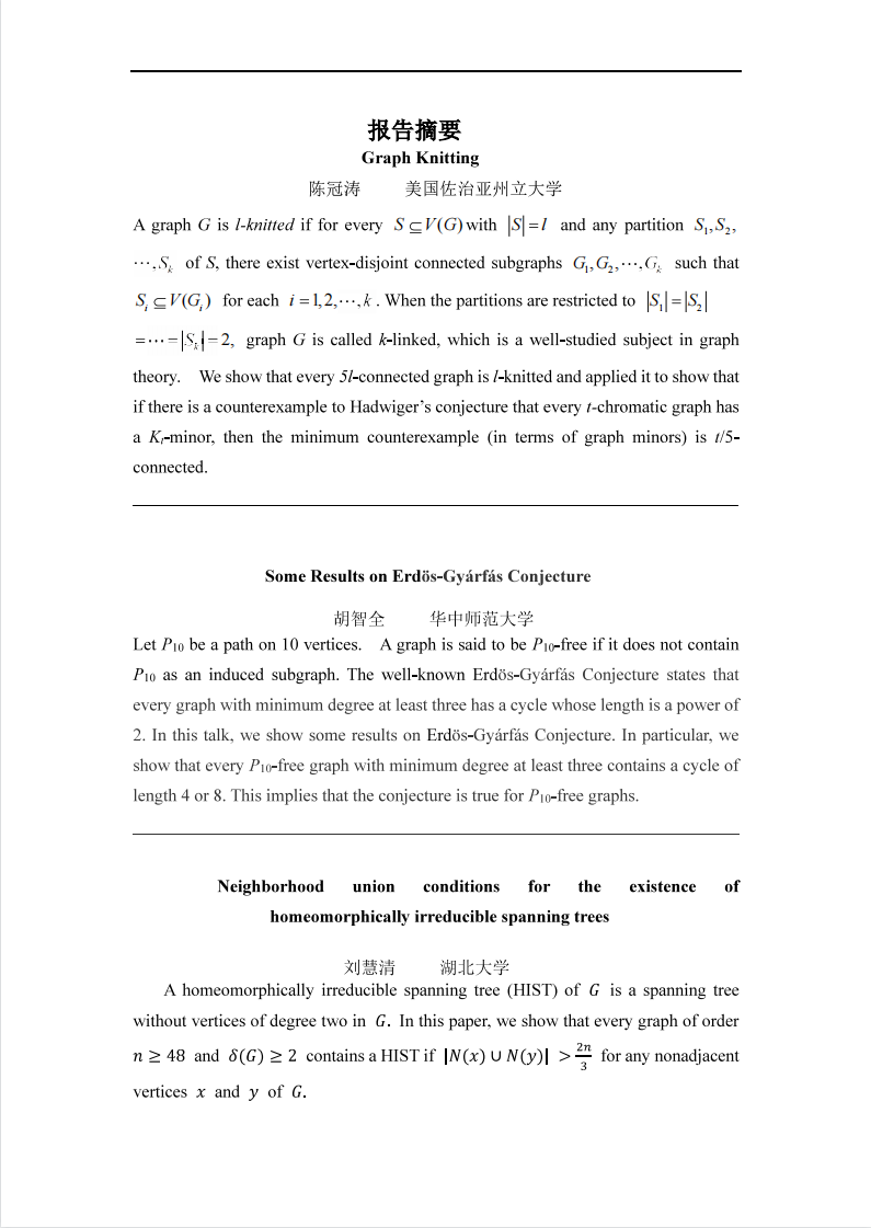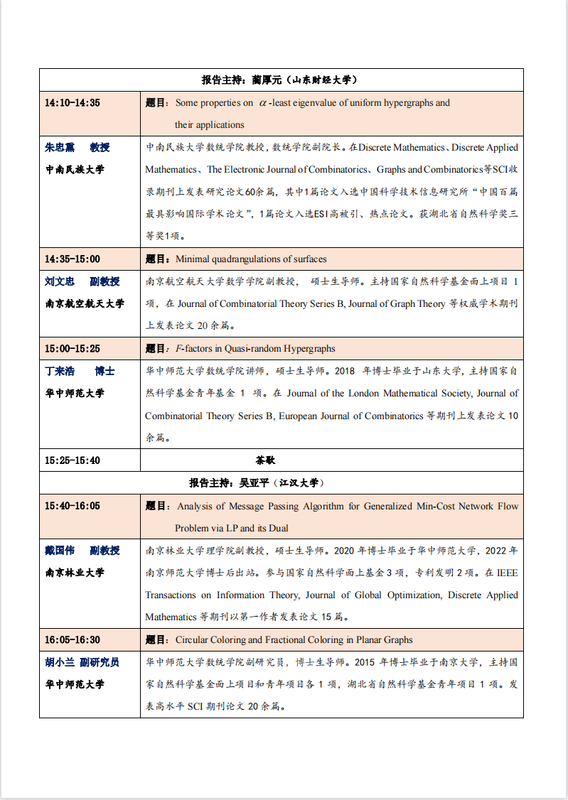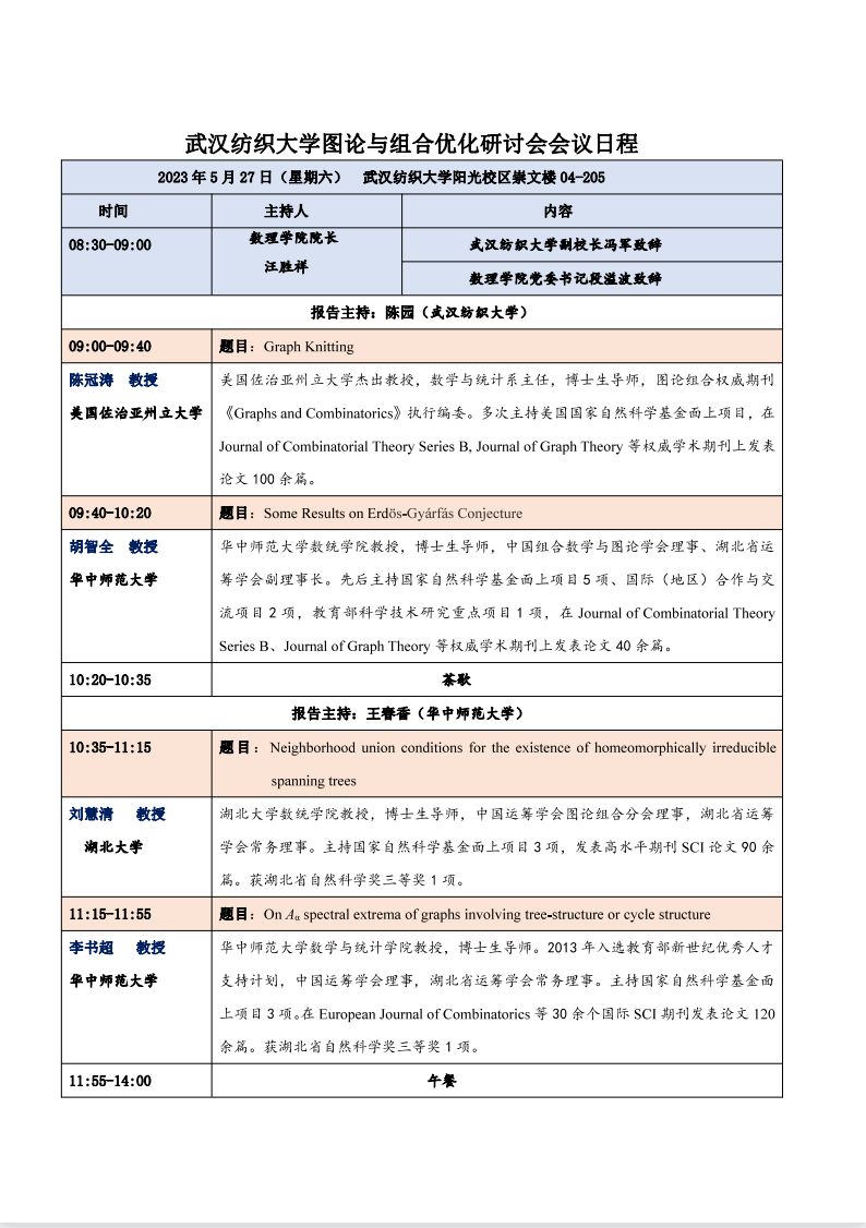 为了更好地了解国内外图论与组合优化领域的前沿热点问题及最新研究进展,交流相关领域的最新研究成果,探讨领域之间的交叉科学问题,促进学术研究水平的提升。十大体育网站数理公司于 2023 年 5 月 27 日-29日 在十大体育网站阳光校区崇文楼04-205举办“2023图论与组合优化研讨会”,本次研讨会的主题为结构图论、极值图论、代数图论、随机图论、图的算法、组合理论、组合计数、组合设计、组合优化及相关问题。热忱邀请各位专家、老师和同学们参加会议。