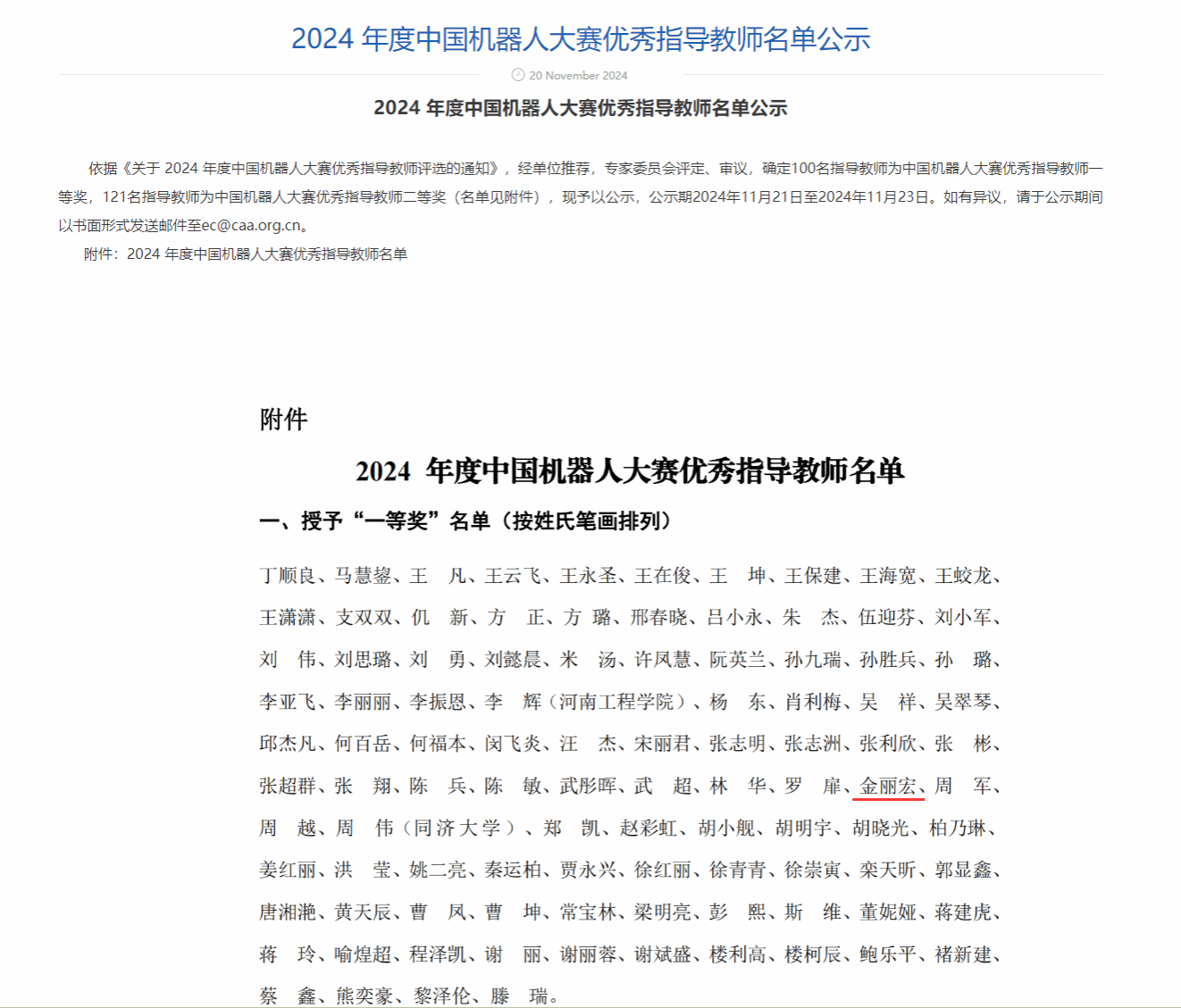 近日,中国自动化学会为鼓励先进,表彰在中国机器人大赛暨RoboCup机器人世界杯中国赛中组织和指导工作突出,成绩优秀的指导教师,针对2024年度举办的中国机器人大赛暨RoboCup机器人世界杯中国赛系列赛事,评选若干优秀指导教师。