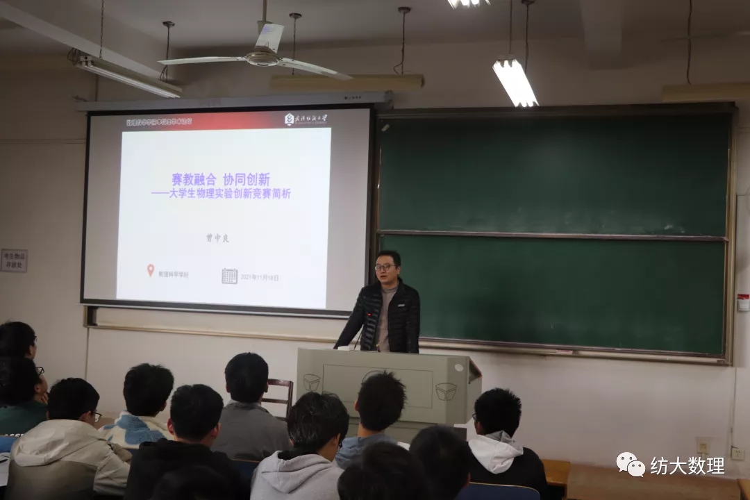 会议伊始,时亚洲老师为在场同学主讲了《数学建模-让数学走近生活》,并鼓励员工积极参加数学建模大赛。他与同学们交流了“为什么学数学”,“数学到底有没有用”,“数学建模给我们带来什么”等问题,他希望同学们能加强自主学习能力,丰富实践知识。随后,曾中良老师向同学们介绍《老员工物理实验竞赛简析》,他以“赛教融合,协同创新”为中心,简要的介绍了老员工物理实验竞赛的办赛背景、办赛目的、组织机构、比赛类别、参赛资格及赛程设置等,并展示部分典型案例。他希望,同学们要有远大的科学理想,正确的世界观、方法论以及团队合作意识,方能成人成才,创新创造。