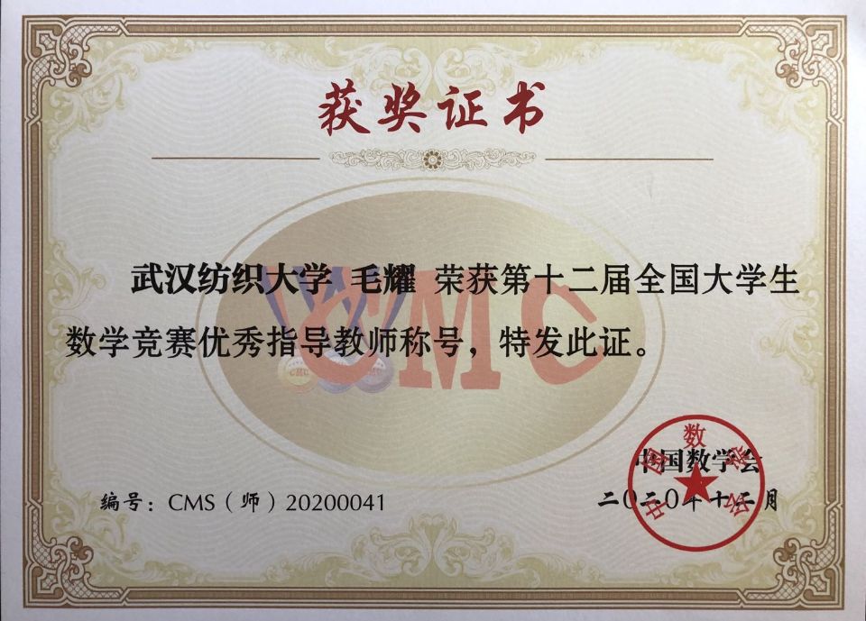 同时,毛耀老师荣获“第十二届全国老员工数学竞赛优秀指导教师称号”,旨在表彰其2020年及以前在全国老员工数学竞赛中的付出与贡献。该奖项为中国数学会在全国范围内第一次评选,本次湖北省仅有5位老师获此殊荣。