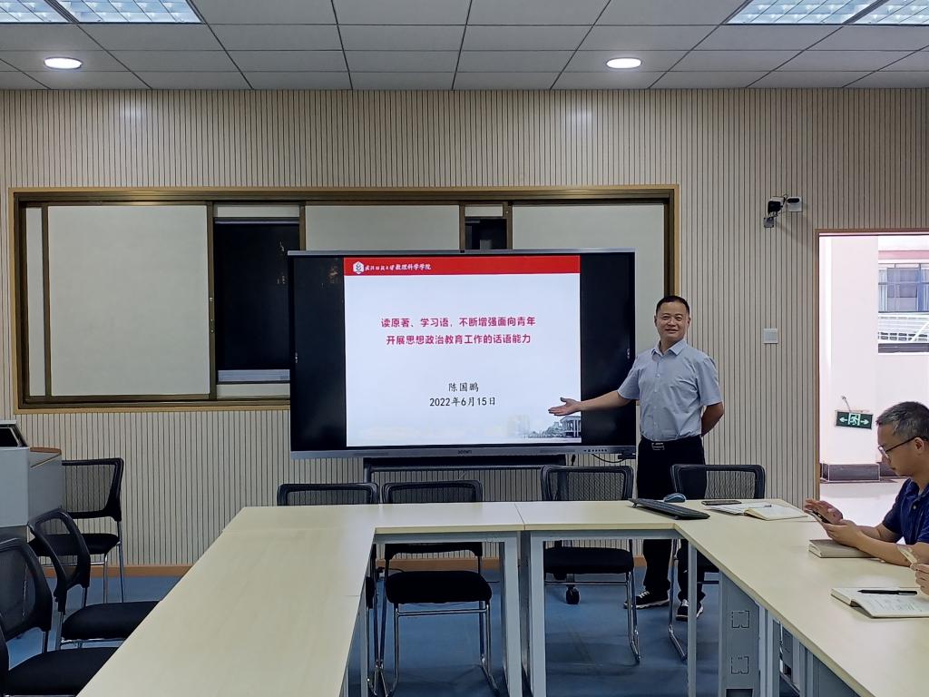 陈国鹏以《读原著、学习语,不断增强面向青年开展思想政治教育工作的话语能力》为题做了学习报告。他从讲政治旗帜鲜明,蕴含极强的政治引领力;行雄文高屋建瓴,蕴含极深的思想理论性;育人才启智润心,蕴含极高的教育艺术性等三个方面报告了自身的学习体会。