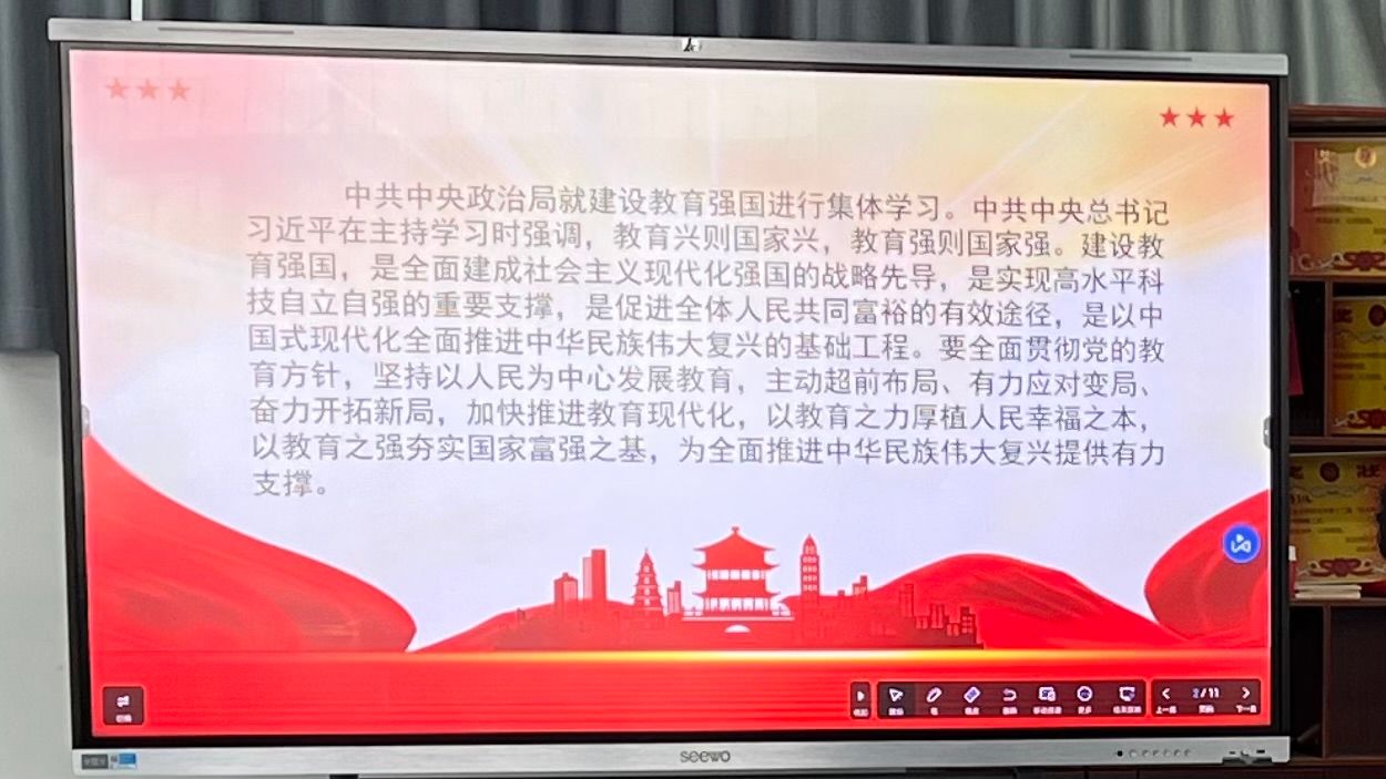 刘文祥同志带领大家学习了习近平总书记致全国优秀教师代表的信和在二十届中央政治局第五次集体学习时的讲话《扎实推动教育强国建设》,了解了建设教育强国的意义、新中国成立以来特别是党的十八大以来我国建设教育强国的进展和成就、我国教育强国建设面临的形势和需要解决的问题,明确了我们建设的是什么样的教育强国、怎样建设教育强国。