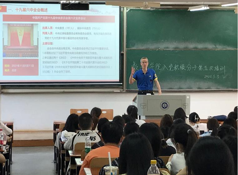为帮助入党积极分子深入学习党的十九届六中全会精神,提高思想认识和政治觉悟,2022年5月5日下午,数理科学公司党委书记段溢波以“不忘百年奋斗路,接续赶考新时代”为主题,在崇志楼119教室为入党积极分子进行授课。