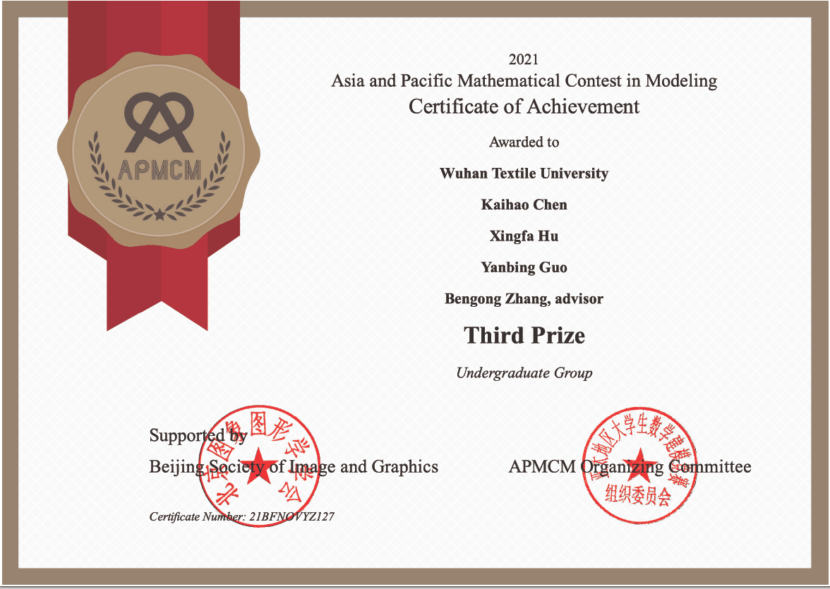 在接受采访时,胡兴发表示,在数学建模学习的过程当中,以各种问题为载体,不仅掌握了解决问题的方法,还有机会接触到各种物理、化学、管理、经济等方面的实际问题。此外,他指出,能够将自己的专业知识运用到解决实际问题中,是一个开阔自己视野的好机会。于是,他第二次又报名参加了亚太地区数学建模大赛。