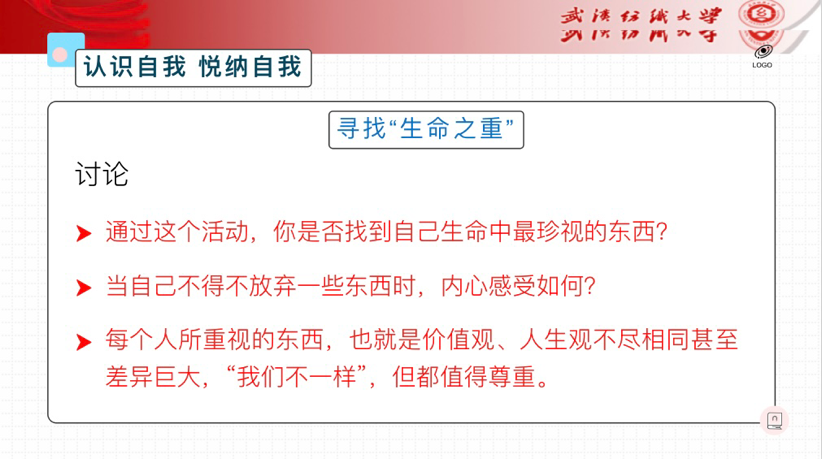 班会向同学们介绍了本次会议主题—“善爱我”,强调此次会议旨在不断完善数理公司心理育人体系,丰富育人内涵,提高同学们的心理素质水平。爱自己,就是要认识自我,正确评价自我,接纳自我:不仅要去爱、去悦纳自己的优点、长处,还要勇敢接纳自己的缺点和不足,在接受自己不足的基础上,努力改进自己、完善自己。爱他人也是如此——欣赏、学习他人的优点,接纳、包容他人缺点。人首先应自爱,爱自己是爱一切的开始,爱自己才能爱别人,爱集体,爱生活。主题班会进行了寻找“生命之重”讨论活动,呼吁同学们认识自我,悦纳自我。