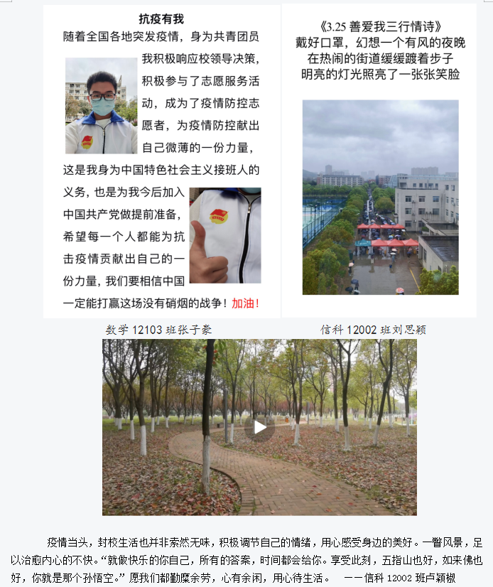 “3.25善爱我”作品征集活动分为三个部分:拍摄视频—记录生活的点滴、三行情诗—善爱自我为自己写诗、抗疫照片—同心抗疫分享最美的你。前期依靠班级心理委员和公司公众号宣传,发动同学积极参加并收到踊跃投稿,涌现出了许多质量颇为不错的作品,通过公众号推文投票评选,在公司公众号对优秀作品展示欣赏。