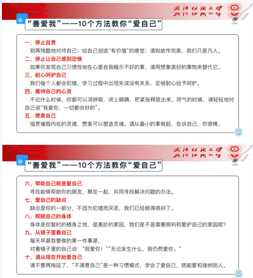 莫道春风归来晚,浮云过后艳阳天。本次以“关爱自我,善待他人”为主题的“3.25善爱我”心理健康系列活动,让因疫情封闭在校的同学们用心感受爱与被爱,让同学们学会在每一个生活点滴中关爱自我、善待他人,积极筑牢个人心理防线,同时也加强了大家众志成城共抗疫情的决心。