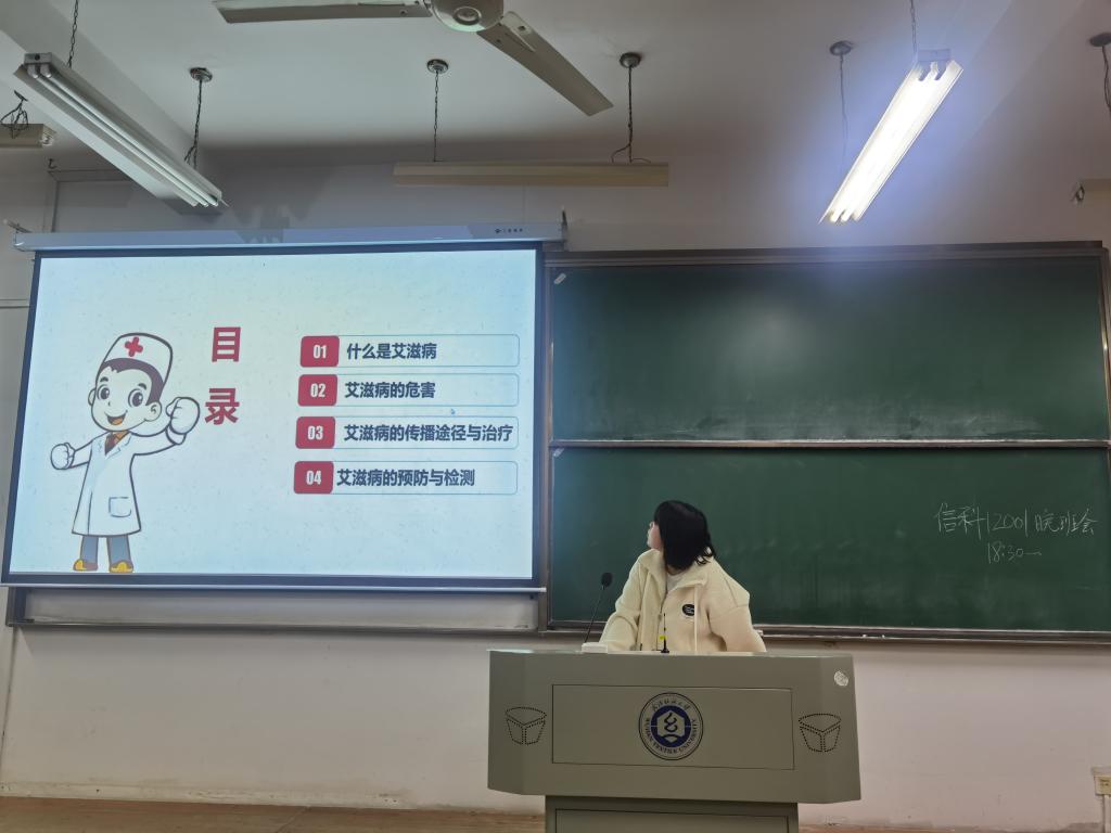 为提高同学们对防艾的认识和自我保护意识,倡导同学们关爱社会,关爱生命,关爱艾滋病人。11月14日晚,十大体育网站员工易文芳、李慧君、马雪琴三位同学分别于崇志楼、崇文楼在20、21级的班会上组织开展预防艾滋病的宣讲活动。