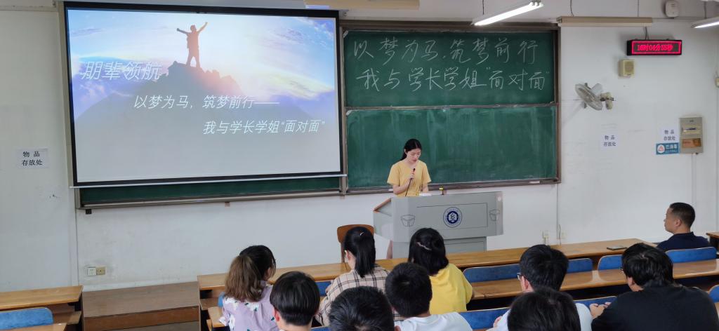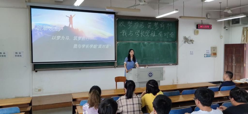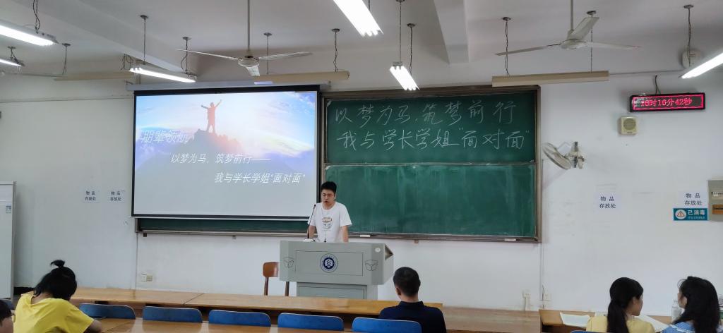 会议伊始,主持人万毅以“以梦为马,筑梦前行”为主题,介绍了开展此次交流会的目的和意义:提供机会使在读学子与优秀学长学姐交流,拓宽眼界增长经验,获得正能量。四位优秀毕业生代表依次介绍自己的考研与就业的经验和心得。