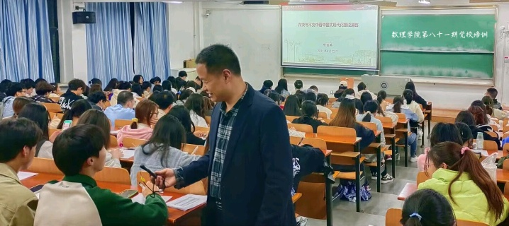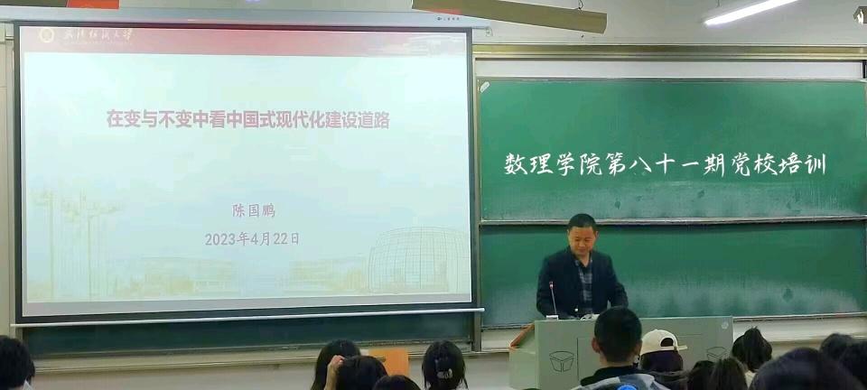 为进一步加强入党积极分子的培训、教育和考察,提升入党积极分子政治觉悟和理论水平,坚定理想信念,端正入党动机,2023年4月22日晚,数理科学公司党委副书记陈国鹏以“在变与不变中看待中国式现代化建设道路”为题,在崇志楼120教室为入党积极分子讲授党课。