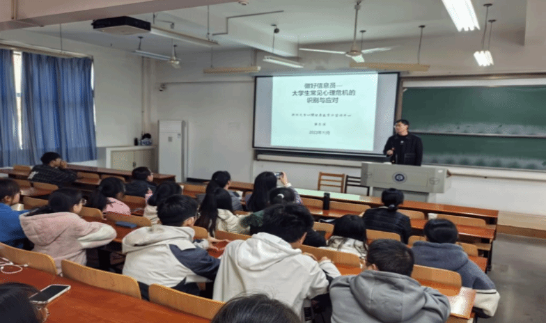讲座尾声,黄东涛主任以某起网络事件为例,解读了抑郁症的典型症状及其相关表现,使同学们对心理健康问题有了更深刻的认识。黄主任还具体分析了学业压力、家庭关系变故、就业困难等心理危机的常见诱因,并结合案例进行了深入的危机应对策略讲解。他鼓励同学们在遇到心理困难时主动寻求帮助,并且提醒大家在他人遭遇心理危机时,应通过主动关心、倾听、耐心陪伴和提供希望等方式,帮助他们渡过难关。