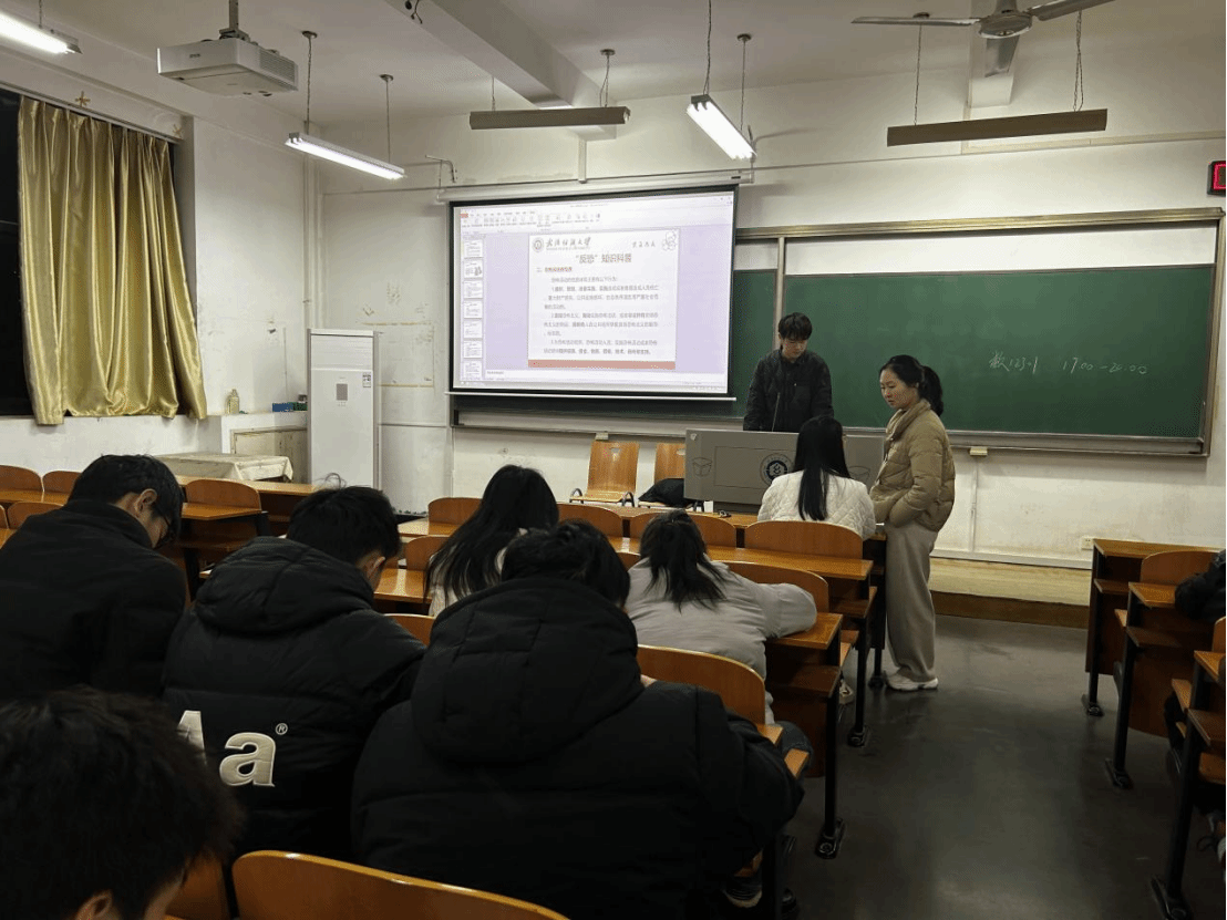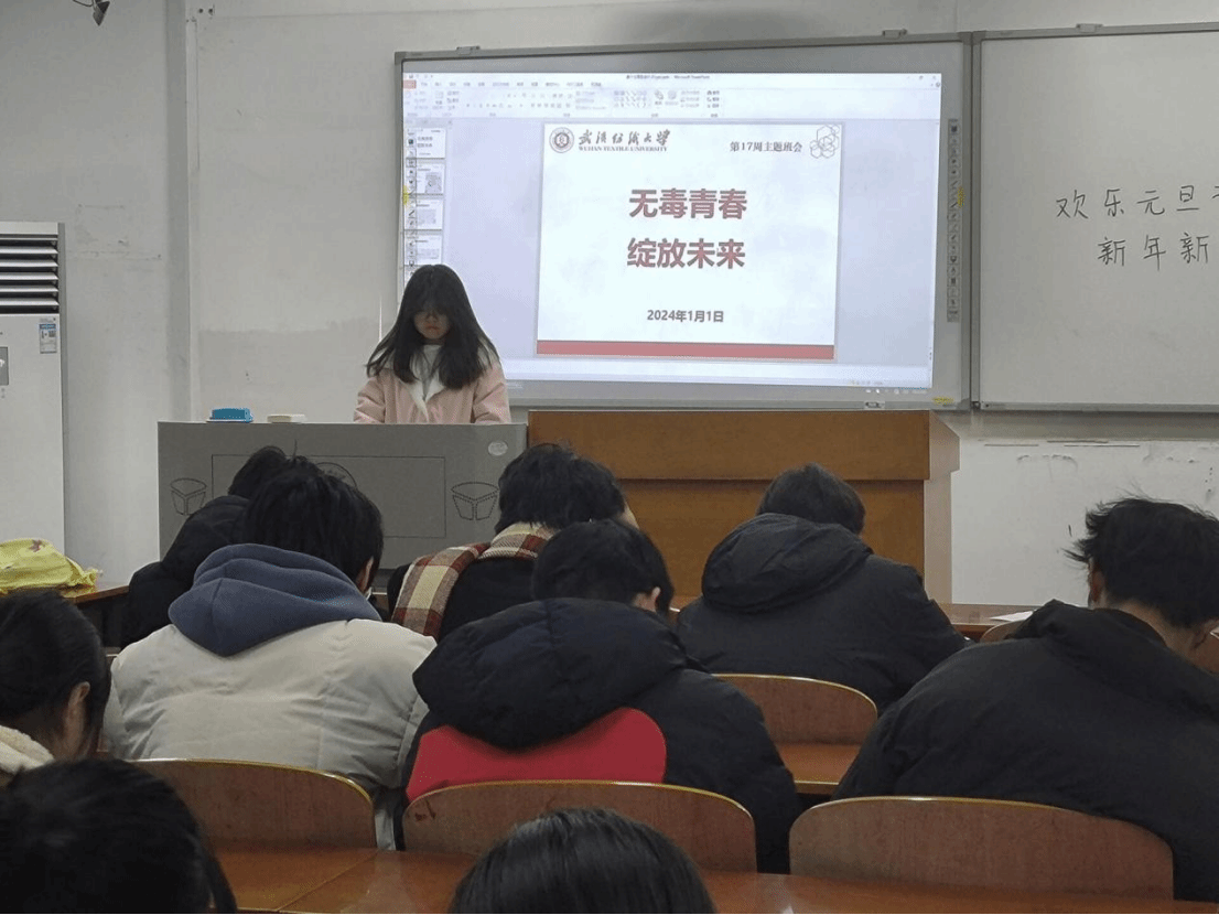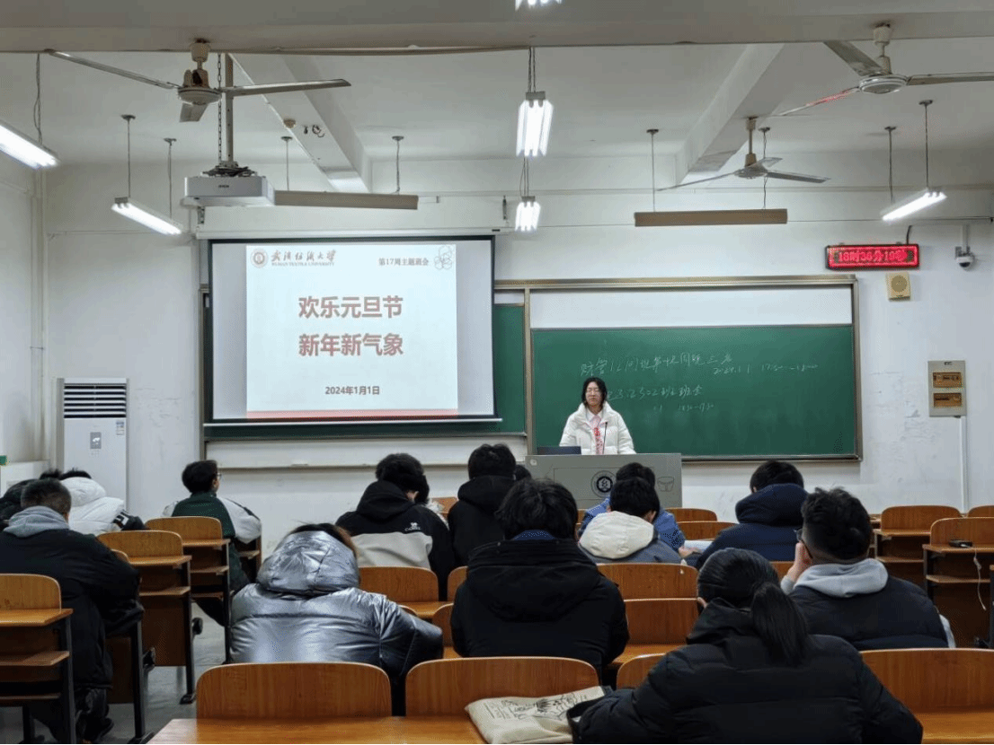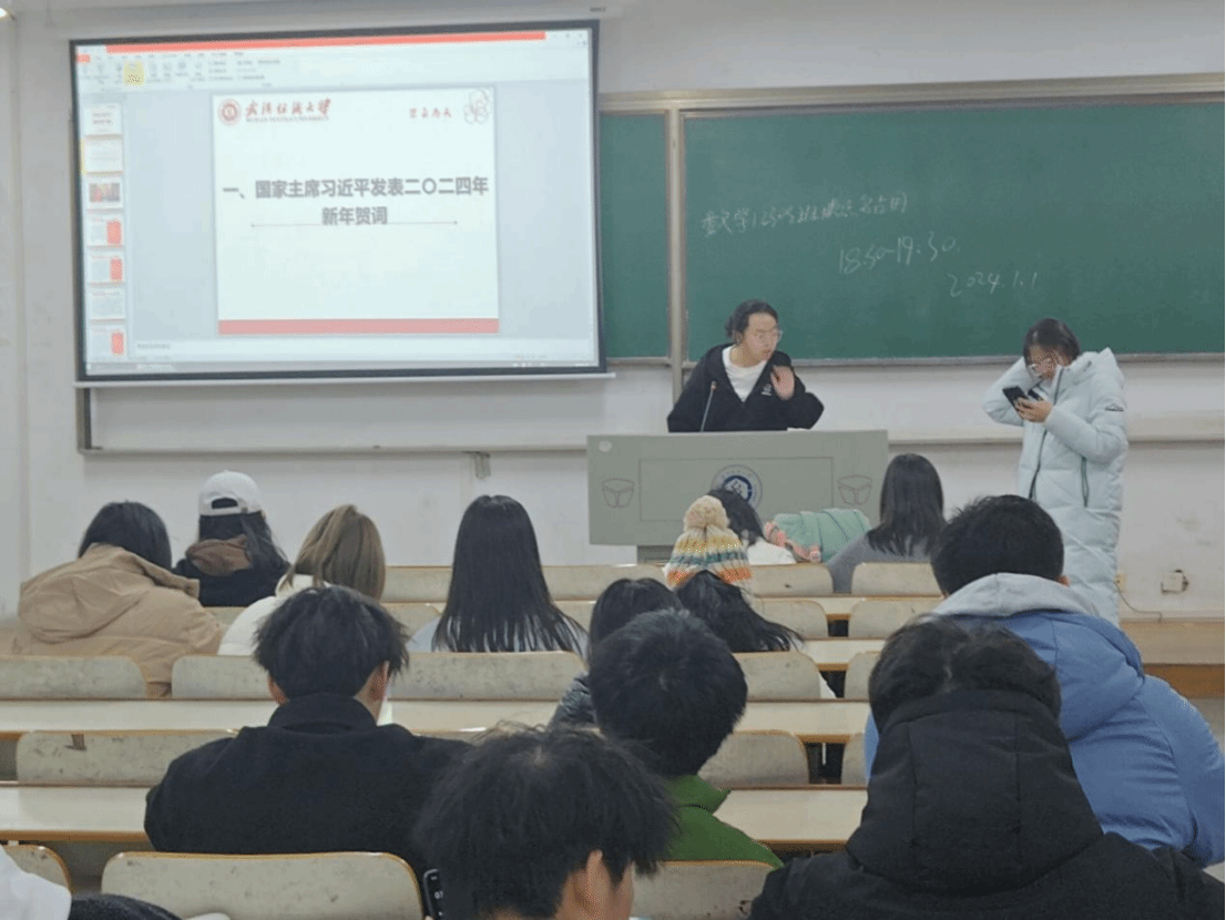 班会伊始,我们一起学习了习近平主席发表的二〇二四年新年贺词和2024年新年贺词。“C919大飞机实现商飞,国产大型邮轮完成试航,神舟家族太空接力,“奋斗者”号极限深潜”,过去的2023,国家加快构建新发展格局,推动高质量发展;“生物工程与健康公司成立王栋教授荣获‘全国五一劳动奖章’,梅顺齐教授领衔‘先进制造与纺织装备教师团队’”,过去的2023,武纺人以时不我待的朝气,向着新的美好出发。在班会上,我们为国家的进步而自豪,为武纺人奋斗不息的拼搏而骄傲。