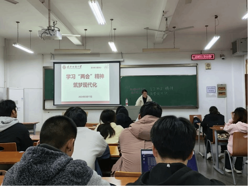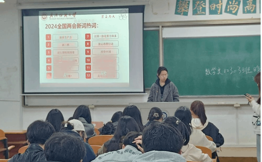 会议伊始,团支书传达了“学习‘两会’精神,筑梦现代化”主题内容,向同学们介绍两会新词热词,介绍“新质生产力”、“新三样”、“超长期特别国债”等新词热词。