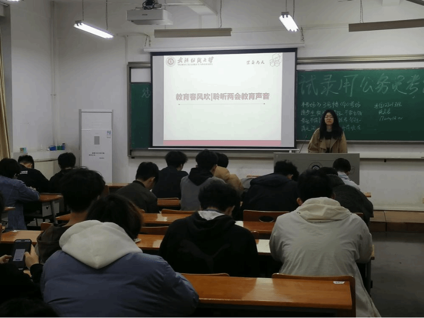 会上,团支书为大家展示了两会的教育领域的“关键数据”以及两会中教育领域最热的关键词。通过全国人大代表的发言内容,表达了国家希望力促高校毕业生就业。