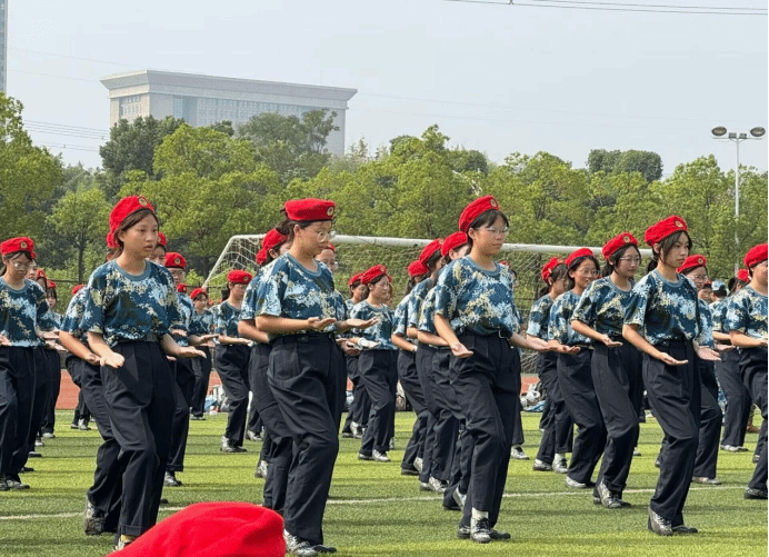 随着音乐的响起,操场上瞬间化身为一片热血沸腾的海洋。各连队方阵依次登场,学员们身着统一的迷彩服,精神抖擞,仿佛一支支即将出征的部队。他们动作整齐划一,从“抱拳礼”的庄重开始,到“直拳冲击”、“勾摆连击”的迅猛有力,每一个动作都精准到位,每一声呐喊都响彻云霄。特别是当全体学员齐声高呼“杀!杀!杀!”时,那气势仿佛能穿透云霄,震撼人心,完美诠释了军体拳的威武与力量。