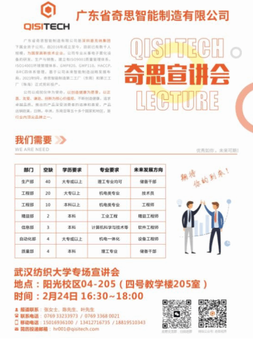 2月24日,公司在四号教学楼205室举办专场招聘宣讲会,邀请到广东奇思智能制造公司人力资源部张总、陈总、叶总为同学们宣讲。