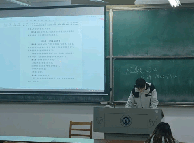 随后,班委们为同学们详细宣讲了攀登奖学金政策。他们不仅介绍了评选条件,如学习成绩优异、综合素质突出等,还深入讲解了评选要求,包括提交的材料要真实、完整、规范等。同时,班委们还公布了评选名额,让同学们对竞争的激烈程度有了更清晰的认识。此外,他们还耐心地说明了评选需要准备的材料,如成绩单、获奖证书、社会实践报告等,为同学们的申请提供了明确的指导。通过这些宣讲,同学们对攀登奖学金政策有了更为系统和深入的了解,激发了大家努力学习、积极进取的热情。