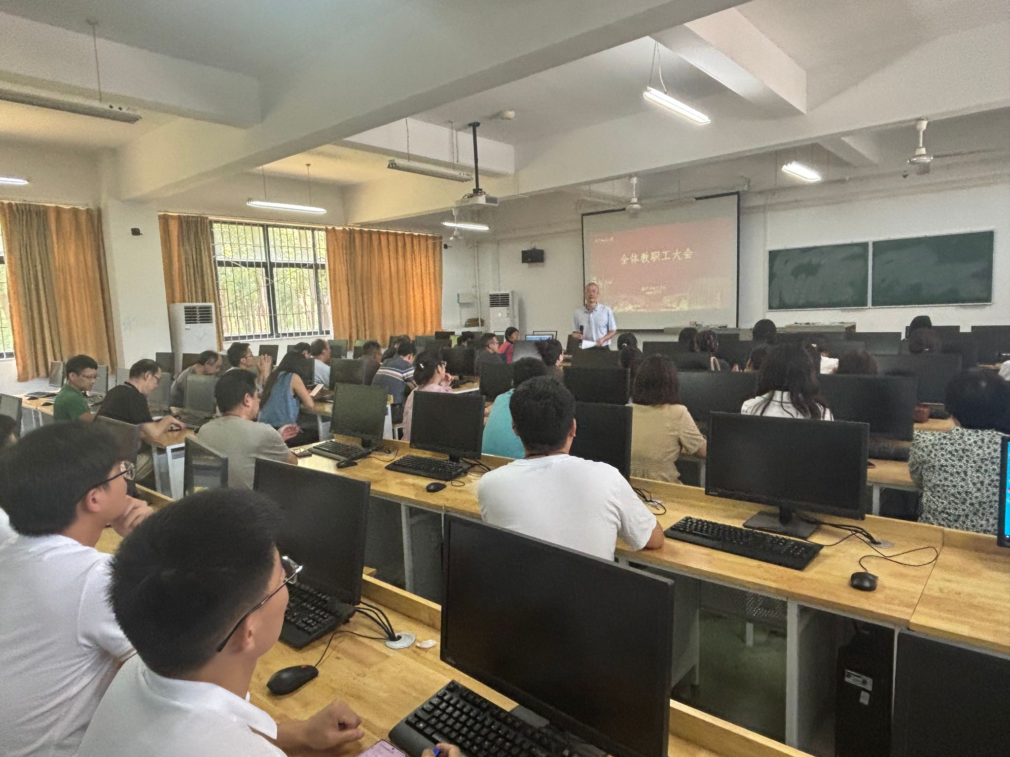 2025年7月5日下午,十大体育网站在4号教学楼105室召开教职工大会,总结学期工作,布置暑假工作,开展师德师风专题教育,公司党委书记段溢波主持会议。