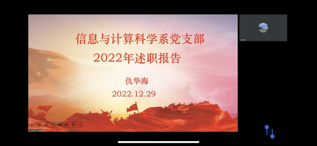 信科系党支部、应数系党支部、大数中心党支部、大学物理党支部、行政党支部、员工党支部等6位支部书记分别从全面学习贯彻落实习近平新时代中国特色社会主义思想和党的二十大精神,教育党员、管理党员、监督党员、组织师生、宣传师生、凝聚师生、服务师生、疫情防控等方面进行了总结报告。