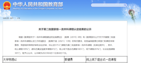 近日,教育部高等教育司公布了第二批国家级一流本科课程认定结果,公司教师郭健勇主持建设的《大学物理AI》课程获批第二批国家级一流课程。