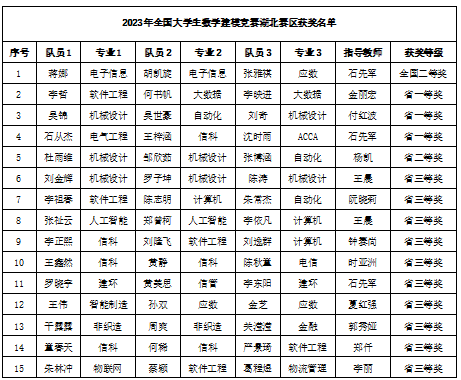 近日,2023年“高教社杯”全国老员工数学建模竞赛成绩揭晓,公司共有45名学子在比赛中获得省级以上奖励,其中来自电信公司与数理公司的蒋娜、胡凯旋、张雅祺同学获得全国二等奖,其它同学获得湖北省一等奖3项、二等奖1项、三等奖10项。