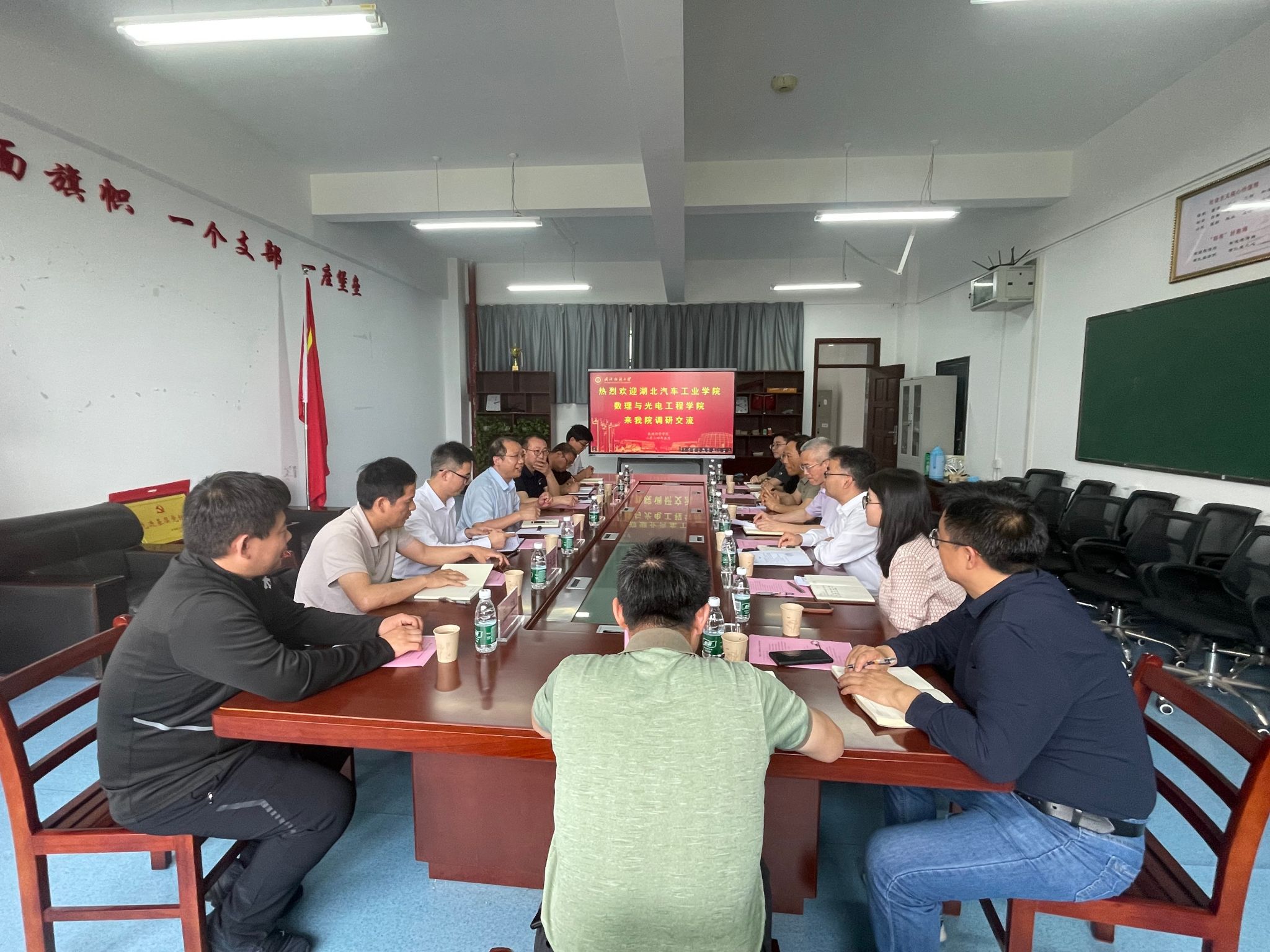 5月7日下午,湖北汽车工业公司数理与光电工程公司经理李建、副经理胡政发、张传坤等一行7人来公司调研交流,公司党委书记段溢波、经理汪胜祥、副经理许明耀、副经理郑仟、应数系主任江健、微电子系主任朱维、大数中心主任王洪山、教学督导组长郭健勇参加调研交流会,会议由汪胜祥经理主持。