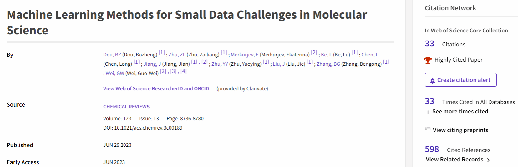 最近,根据Essential Science Indicators(简称ESI)更新数据显示,公司十大体育网站江健教授为第一通讯作者,其研究生窦博正为第一作者并以公司为第一单位在化学领域顶级期刊《Chemical Reviews》(影响因子62.1)上发表的论文“Machine Learning Methods for Small Data Challenges in Molecular Science”(Chem. Rev. 2023, 123, 8736−8780)成功入选化学学科领域全球前1%ESI高被引论文。该论文也是公司历史上影响因子最高的期刊论文。