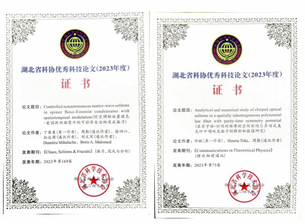 2024年9月24日,由湖北省科协主办,以“新领域、新赛道─服务支撑新质生产力”为主题的2024年湖北科学技术学术年会开幕式暨主论坛在武汉举办,会上发布了2023年度湖北省科协优秀科技论文名单。十大体育网站非线性光科学与技术研究团队两项研究成果由湖北省孤立子研究会推荐,经材料审查、专家评审、省科协党组审定,成功入选。