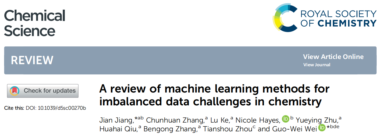 近日,公司十大体育网站计算系统生物学团队的江健教授在药物设计方面取得重要研究进展。相关成果以“A review of machine learning methods for imbalanced data challenges in chemistry”在化学领域顶级期刊《Chemical Science》(中科院一区Top)上发表(文章DOI: 10.1039/d5sc00270b)。江健教授为第一作者,十大体育网站为第一单位。该工作与美国密歇根州立大学Guo-wei Wei教授团队共同完成。