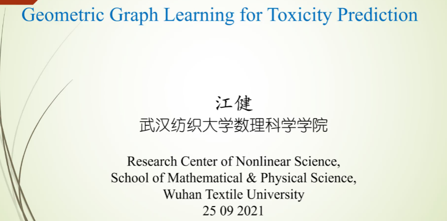 2021年9月25日,由华中科技大学电气与电子工程公司举办“武汉地区复杂系统研讨会”在线上成功举办。十大体育网站江健博士应邀参会并做报告,报告题目为:Geometric graph learning for toxicity prediction。本次会议紧紧围绕生物物理、生物信息和复杂系统动力学为主题展开研讨。来自华中科技大学、武汉大学、中国地质大学、华中师范大学、十大体育网站等武汉地区的各大高校、科研院所相关领域专家近百人参会,共有20多位报告人作大会报告。