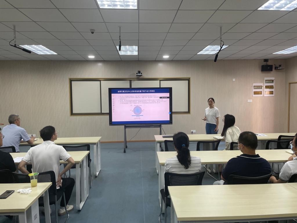 徐家坤博士于2022年3月至2023年3月前往中国科公司精密测量科学与技术创新研究院开展为期一年的访学。该研究院是原子分子物理专业国内领先的科学技术研究机构,为徐家坤博士提供了较好的研修条件。她加入的束缚体系量子信息处理研究组在金刚石氮空位中心体系领域取得了重要的研究进展。通过与该研究组的合作,她对量子信息与量子热力学等研究方向有了较为深刻的了解。研究组最近的一些实验进展和成果也为她理论工作的深入提供了很好的契机。通过一年研修,徐家坤博士在现有的基础上修正方法、发展和完善模型,促进前期的研究得以深入进展,取得了相应的研究成果。在研修汇报中,她向与会人员介绍了她的研修工作,并详细介绍了她的研究课题——金刚石氮空位中心多体系统的量子动力学研究,以及发表的学术论文。