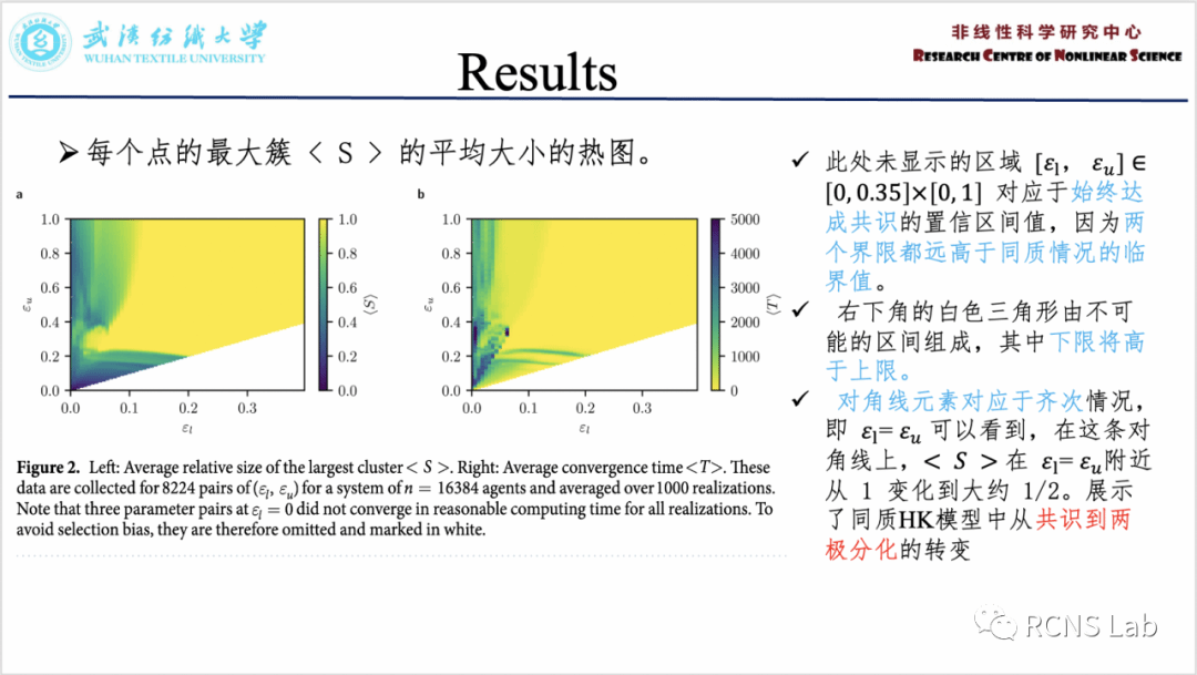 黄海芳 :本次汇报了一篇名为《When open mindedness hinders consensus》的文献。本文对 Hegselmann-Krause 有界置信度意见动态模型进行了详细研究,该模型具有从不同区间 [ε1,εu] 的均匀分布中得出的异质置信度 εi。使用二叉搜索树 (BST)算法,揭示了一种高度复杂且非单调的行为,在该区域中具有可重入共识阶段,在该区域中,对于同质情况预计会分裂成多种不同的意见。并且发现对相图的仔细探索以及广泛的有限尺寸分析能够确定导致这种反直觉行为的机制。此外得出结论:如果系统中仍然存在思想封闭的代理人,那么增加思想开放的代理人的比例可能会导致共识的丧失。其根源在于思想封闭的代理人在舆论空间中的缓慢运动 。当包含很大一部分思想非常开放的代理人时,他们很快就会收敛于多数主义观点,那么思想封闭的代理人就会被抛在后面,从而无法达成完全的共识。相反,当思想封闭的代理人与一小部分思想适度开放的代理人共存时,更容易达成共识,而后者向多数意见的收敛速度要慢得多。这种相对缓慢的趋同允许与思想封闭的代理人进行互动,这些代理人慢慢地被拖向多数主义观点 。