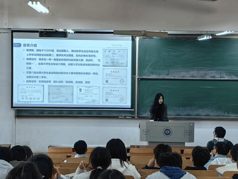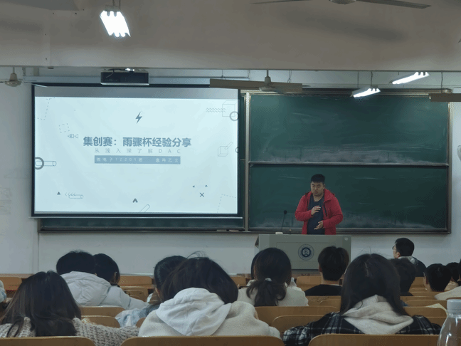 庞冉乙文同学则分享了他在比赛过程中遇到困难时的应对方法。他告诉同学们,在面对困难时,不要惊慌失措,要保持冷静,积极寻找解决问题的途径。同时,他还向我们介绍了他在参加集创赛时遇到的选题。深入浅出的向同学们拆解选题,激发了同学们探索求知的欲望。此外,他还鼓励同学们要勇于尝试,敢于创新,不断突破自己的思维局限,在挑战中不断成长。他分享的一些应对困难的具体策略,让同学们受益匪浅。