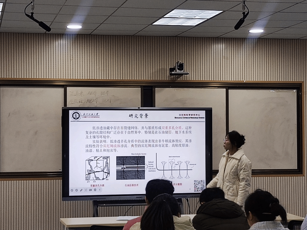 胡佳青汇报了《Fractal Study of Bingham Fluid Flow in Dual Porous Media》。非牛顿流体在多孔介质中的渗流特性研究在石油工程、环境工程和生物工程等领域具有广阔的应用前景。以往研究大多基于单一多孔介质中牛顿流体的讨论,忽略了双重多孔介质中非牛顿流体的研究。本研究拟聚焦于双重多孔介质中宾厄姆(Bingham)流体流动的分形特征,旨在揭示复杂地质结构内非牛顿流体行为的微观机制。基于广义达西定律和分形理论,我们拟首先构建描述双重多孔介质结构和宾厄姆流体流动特性的数学模型,结合分形维数与孔隙结构参数,能够更精确地模拟真实地质条件下的流体传输过程。