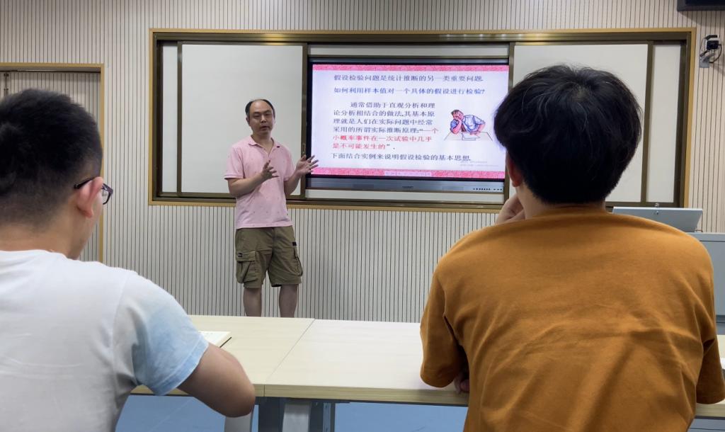 万立老师授课的题目为“假设检验的基本概念与基本思想”。万老师从三个方面进行了授课:一是假设检验问题的提出,二是假设检验的基本思想,三是假设检验中两类错误。万老师讲课深入浅出,全程脱稿,利用通俗易懂的语言将严谨的数学知识娓娓道来,使问题深入浅出。同时,万老师善于将较难理解的问题通过浅显的例子展示出来,体现了扎实的教学基本功。