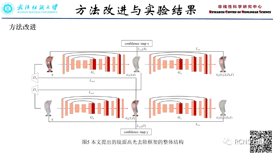 陈俊超:高光泽皮革、玻璃、塑料、金属部件等具有镜面反射特性的物体图像表面上的高光,使得适用于漫反射特性的物体检测、内在图像分解和跟踪等光学测量技术难以直接应用,因此高光检测与消除一直是计算机视觉研究领域的热点问题。然而,配对数据集的获取在现实中存在一定的困难,但我们可以很容易获得大量非配对数据。以CycleGAN为首的对偶生成对抗网络,是一种无监督的学习框架,该框架可充分的利用非配对数据集学习两个域之间的映射关系。本文在经典CycleGAN的基础上建立了改进的对偶生成对抗网络框架,该框架主要解决以下两个问题: