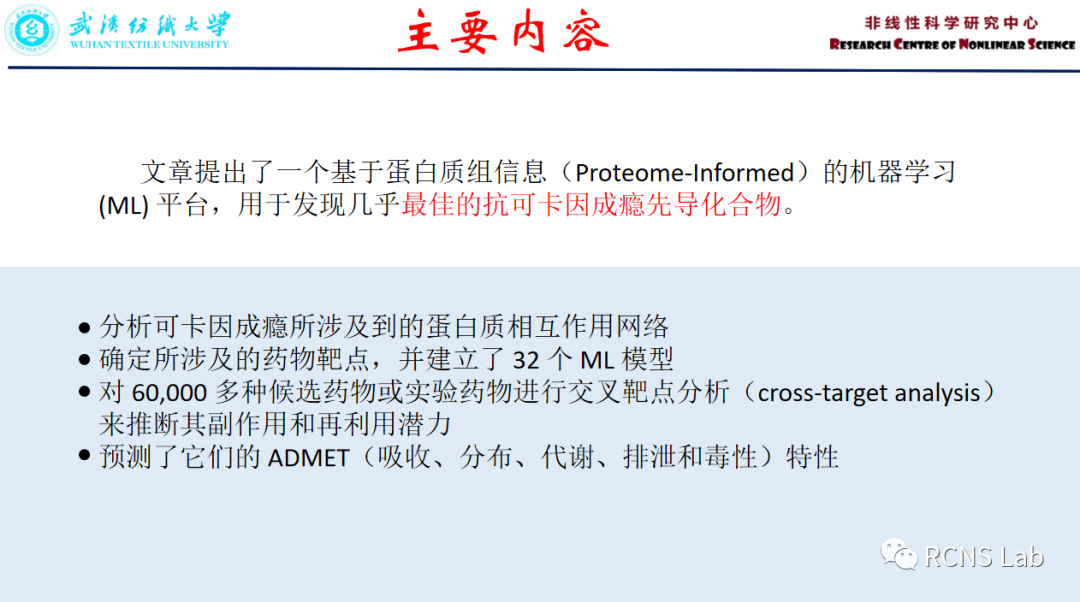 窦博正:分享了一篇名为《Proteome-Informed Machine Learning Studies of Cocaine Addiction》的文章。文章提出了一个蛋白质组信息机器学习(ML)平台,以发现最优的抗可卡因成瘾的先导化合物。文章分析了可卡因依赖PPI网络,确定了141个涉及的药物靶点,并建立了32ML模型,对6万多种候选药物或实验药物进行交叉靶点分析,以分析其副作用和再利用潜力,然后进一步预测它们的ADMET(吸收、分布、代谢、排泄和毒性)特性。我们的平台显示,基本上所有现有的候选药物筛选中都未达到标准,但确定了几个最佳的优化线索。