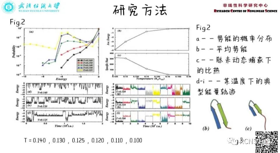 袁洁:在本次汇报中分享了一篇名为《Mechanism for the α-Helix to β-Hairpin Transition》的文献,本文对α-Helex和β-Hairpin的转换进行解析。富含α-Helix的蛋白质聚集成富含β-Hairpin的淀粉样纤维,与一些致命性疾病有关,本文主要对聚丙氨酸进行离散分子动力学模拟,根据在温度、环境的改变下带来的蛋白质结构状态改变。采用Four-Bead Model简化模型,从多角度分析β-发夹中间体的存在性,以及结构状态改变的条件。
