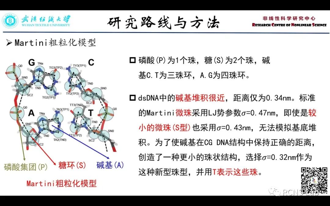 木子淳(线上汇报):本次汇报了一篇名为《Martini Coarse-Grained Force Field: Extension to DNA》的Martini 粗粒化DNA模型。该模型系统地参数化了一个可以与Martini力场兼容的DNA粗粒度(CG)模型。该模型将每个核苷酸映射为6到7个CG珠,并采取Martini力场的标准势能函数(包括成键势和非成键势),通过计算PMF来获得相应的碱基堆积势以及碱基配对的氢键势。以上的相互作用势仅适合单链DNA (ssDNA)的原子模拟,对于双链DNA (dsDNA)采取弹性网络用于保留dsDNA和其他特定的DNA构象。本文提出的Martini DNA模型,展现了单个碱基、ssDNA和dsDNA以及DNA -蛋白质复合物的性质。该模型开创了模拟DNA与其他生物大分子相互作用的方法。