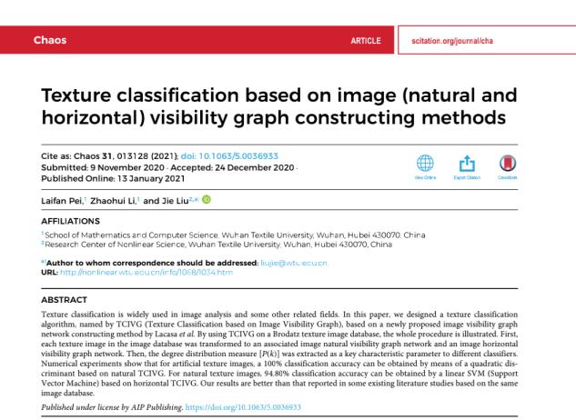 2021年1月,国际知名期刊《Chaos》在线发表中心复杂系统控制与应用团队刘杰教授指导的研究生裴来凡、李朝晖题为“Texture Classification Based on Image (Natural and Horizontal) Visibility Graph Constructing Methods”文章。该论文通讯作者为中心刘杰教授,第一作者为研究生裴来凡和李朝辉同学。纹理分类在医学图像分析等领域有着广泛的应用。本文提出了一种基于可视图的纹理分类方法。首先,将数据集中的每个Brodatz纹理图像转换为相应的IVG(图像可视图)和IHVG(图像水平可视图)。然后,提取其度分布P(k),并将其输入到不同的分类器中。主成分分析(PCA)应用于输入向量,以减少特征数量并避免最终过拟合,并采用5-折交叉验证程序。利用人工纹理图像的IVG二次判别分析法(QDA)可获得100%的分类准确率。在自然纹理图像的IHVG上,利用线性支持向量机可以获得94.80%的分类准确率。2021年3月,该论文在湖北省工业与应用数学学会获得优秀论文三等奖。