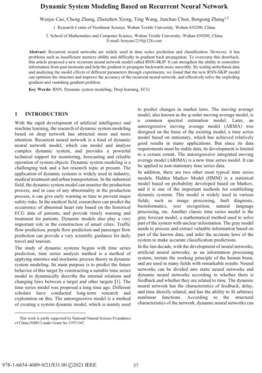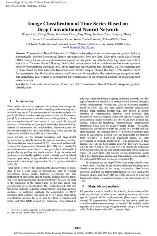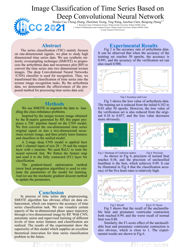 2021年7月,由中国自动化学会控制理论专业委员会、中国自动化学会、中国系统工程学会主办,上海大学承办,中国科公司数学与系统科学研究院、中国工业与应用数学学会、Asian Control Association、IEEE Control System Society、Institute of Control, Robotics and Systems, Korea、The Society of Instrument and Control Engineers, Japan、上海交通大学、上海市自动化学会协办的第40届中国控制会议(CCC2021)在上海顺利召开。由中心大数据分析及应用团队张本龚教授指导的研究生曹文洁等人题为“Image Classification of Time Series Based onDeep Convolutional Neural Network”的论文被大会接收,并在大会上交流。该文主要工作是利用深度神经网络对心律失常数据集进行数据分类。对于时间序列类型的数据分类是研究心率(ECG)、脑电波(EEG)等疾病的重要任务和关键问题。随着深度学习技术的发展,卷积神经网络(CNN)在图像识别任务中取得了巨大的成功。本文首先采用synthetic minority oversampling technique (SMOTE)技术对数据进行预处理实现数据增强效果,然后通过递归图将时间序列转换为二维纹理图像进行研究。最后使用特定结构的深度卷积神经网络进行图片分类识别。以心律失常数据为例,通过准确率、精确率、召回率、F1-score等指标对分类结果进行检验,验证了该方法处理MIT-BIH心律失常数据集的有效性,验证了将时间序列分类任务转化为图像识别任务这一思路的正确性,对于时间序列格式的疾病分类研究具有重要意义。