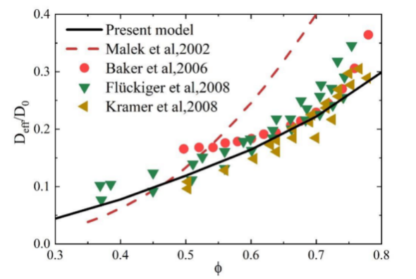 2021年10月,国际知名期刊《Fractals》(IF:3.665)在线接收题为:“Effective gas diffusion coefficient of fractal porous media with rough surfaces by Monte Carlo simulations”的论文,该论文通讯作者为中心郑仟副教授,第一作者为研究生尹作壮同学。气体扩散系数是表征多孔介质输运特性的一个重要参数。本文基于微观毛细管的分形特征,采用蒙特卡罗方法研究了毛细管表面粗糙度对气体扩散的影响,提出了粗糙表面多孔介质有效气体扩散系数的概率模型。该模型表示为多孔介质几何参数的函数,如孔隙度、孔隙分形维数、迂曲度分形维数和相对粗糙度。论文着重探讨了相对粗糙度对有效气体扩散系数的影响,结果表明,粗糙表面多孔介质的有效气体扩散系数随着相对粗糙度的增加而减小。此外,该研究还详细分析了多孔介质其它结构参数对气体扩散的影响。该模拟方法可推广用于粗糙表面分形多孔介质中的气体流动和传热过程的分析。