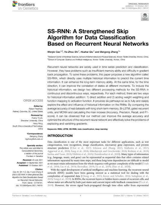 2021年10月,国际知名期刊《Frontiers in Genetics》(IF:4.6)在线发表中心大数据分析及应用团队张本龚教授指导的研究生曹文洁题为:“SS-RNN: A strengthened skip algorithm for data classification based on recurrent neural networks”的论文。为了有效地捕获序列数据中的长期依赖关系,文章提出SS-RNN模型,它允许历史信息通过不同的方式再次添加至当前时刻。文章共设计了六种不同的跳跃模式,模拟添加过去信息的可能方式,并在五个与疾病相关具有不同大小和数据类型的数据集上进行测试。通过与原始LSTM、GRU、Bi-LSTM以及最新的方法RNN+GRU, RNN+LSTM, MCNN进行比较,结果表明,该方法可以显著提高序列数据分类的准确性。此外,最好的方法是不连续的添加,且不需要加权和函数映射的方式,它能有效地解决梯度消失和梯度爆炸的问题,模型性能与跳跃阶数在不同的数据集间也存在一定的关联性。SS-RNN通过优化LSTM模型为提高序列数据的分类精度提供了一种新的思路,因此,使用者也可以通过添加SS-RNN模块来优化自己的网络模型,其对于疾病的分类诊断和精准治疗具有重要意义。